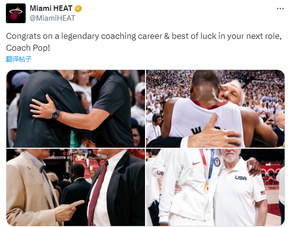热火官方晒波波维奇拥抱斯波尔斯特拉、韦德以及阿德巴约的旧照,配文写道:恭喜你创造伟大的执教生涯,祝您在新的职业上一切顺利。