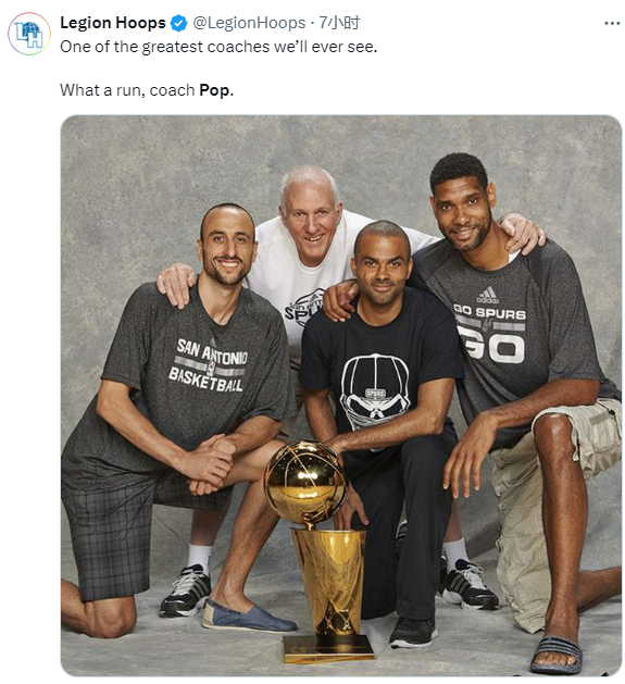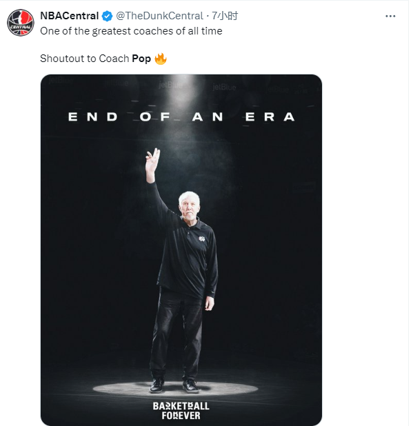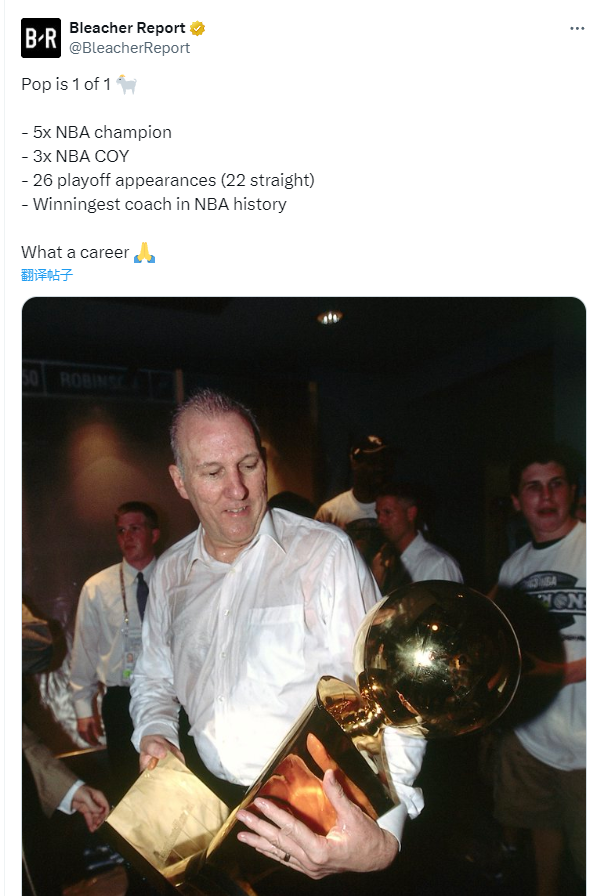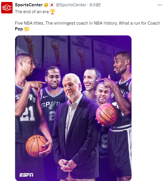 SportsCenter晒P照写道:一个时代的终结,5届总冠军,NBA历史上胜场最多的教练,波波教练教练生涯太辉煌了。